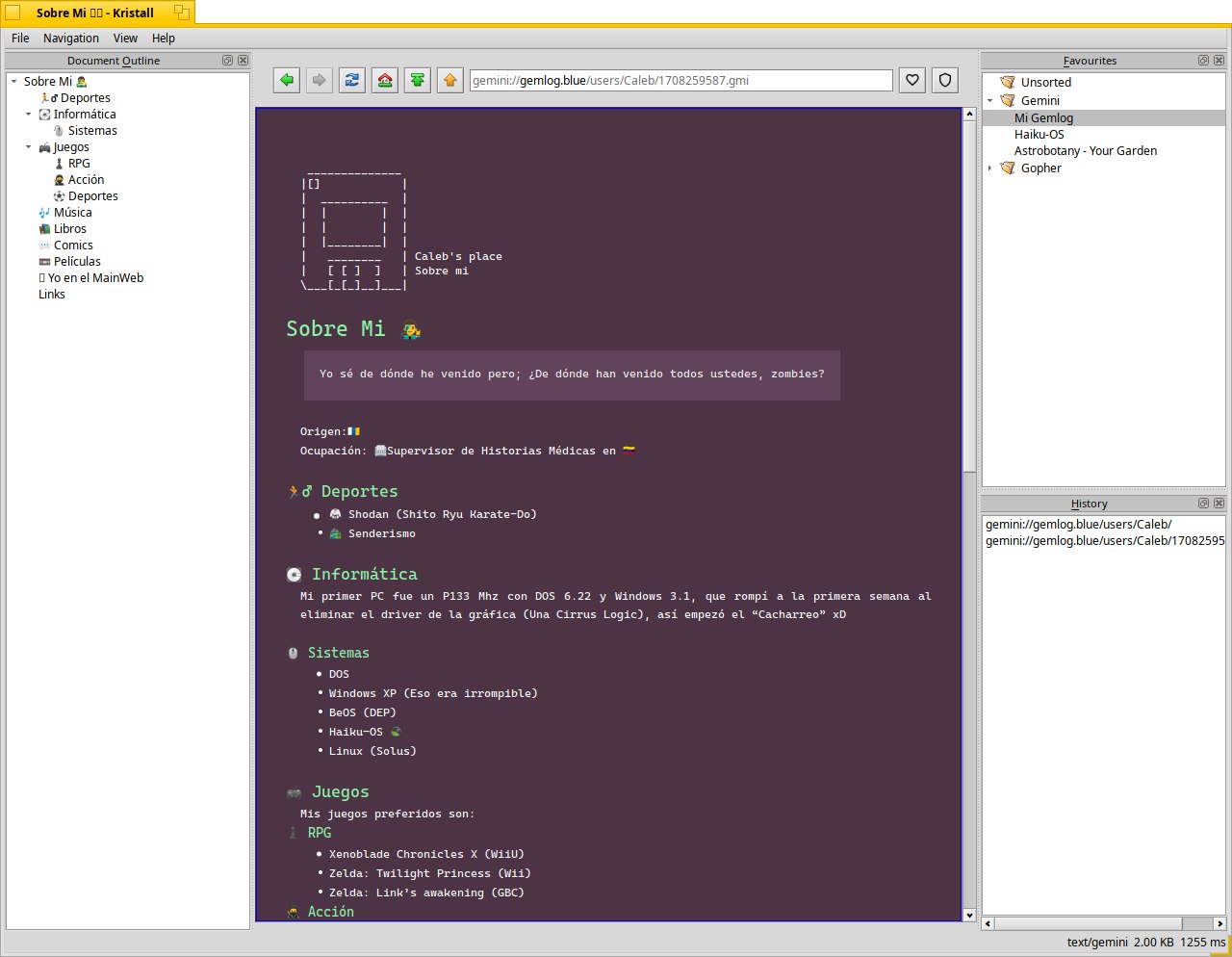 Captura de pantalla tomada por mi de Kristall usado en Haiku-OS (32 bits) el mismo día que me decidí a escribir por fin en Gemlog.blue.