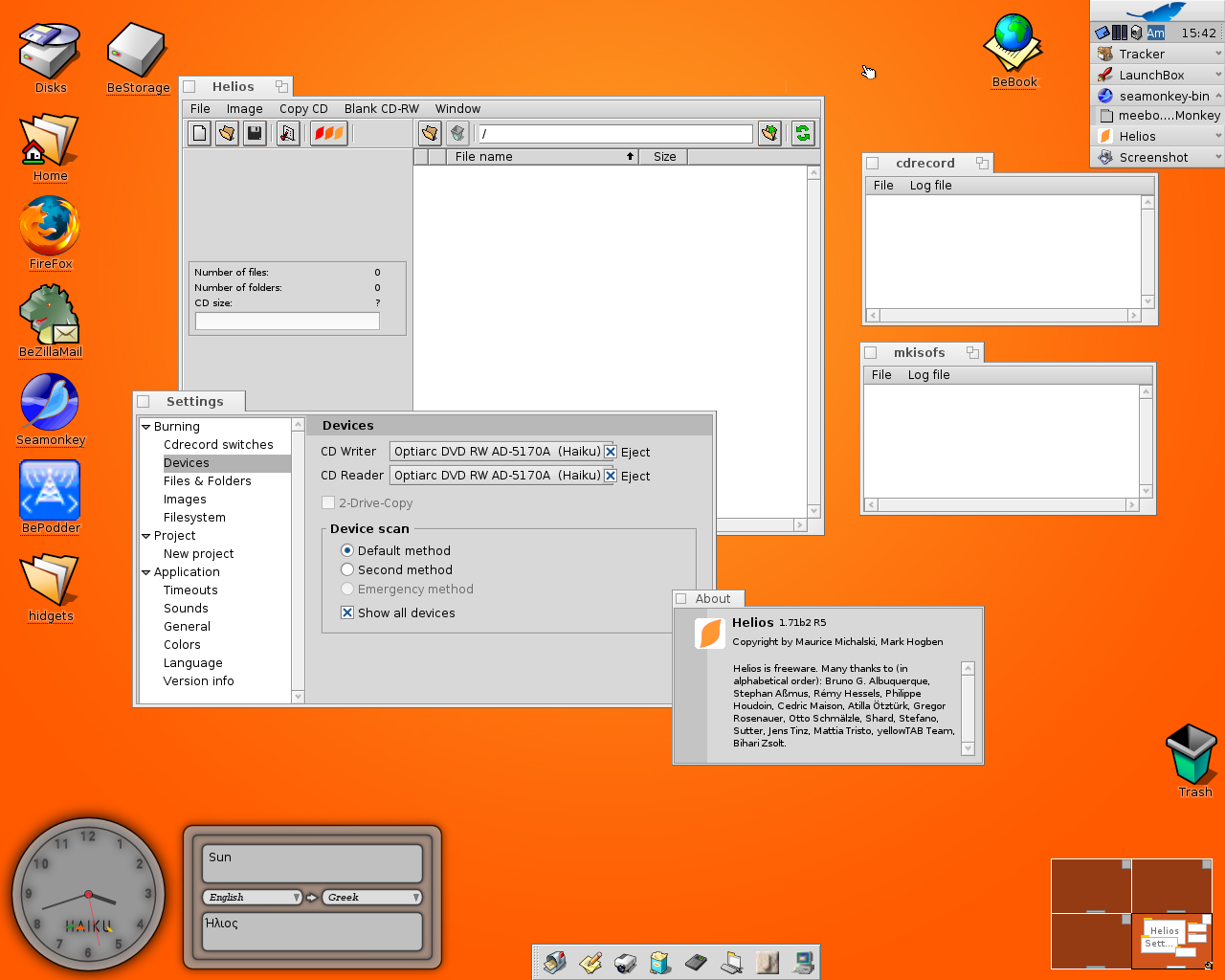 Mas novedades son: Helios, el programa de grabación de Cd's también funciona en haiku, así como NaviTracker, que es un Tracker mejorado que ya vió la luz en BeOS , también han programado un widget que usa el traductor de google. Pero como reza el refrán una imagen vale mas que mil palabras y os voy a dejar mas de una imagen así que opinad vosotros mismos.
