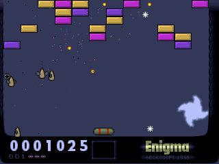 Enigma fue nuestro primer juego. Escrito completamente en ensamblador, se ejecuta en DOS, Win3.1 y Win95. Es una de las mejores versiones de Breakout disponibles para PC, aunque es mucho más que solo Breakout. Tiene 5 minijuegos especiales y totalmente originales, muchos objetos, 5 tamaños diferentes de cohetes (mucha pirotecnia :) y algunos monstruos realmente bonitos. Este juego es difícil, la versión shareware tiene 10 niveles y la versión registrada tiene 160 niveles, comienza bastante fácil pero hacia el final del juego los niveles se vuelven terriblemente difíciles.Descargas