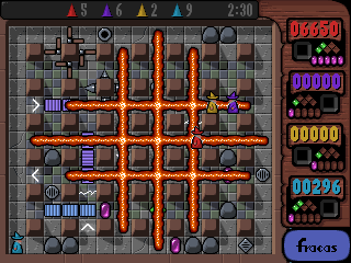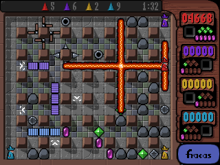 Fracas está actualmente en desarrollo. Será nuestra segunda producción y esperamos tenerla lista en unos meses. Debajo del logo hay un par de sprites del juego, si miras de cerca puedes ver ejemplos del anti-aliasing en tiempo real del juego. Los jugadores controlarán a los magos, ya sea ayudándose o matándose unos a otros con hechizos hechos de fuego, viento y magia. Si te gusta Bomberman, creemos que te gustará este juego y prometemos hacerlo tan extraño como Enigma. Visita la página nuevamente para obtener información actualizada. (Esta información fue actualizada por última vez el 8/14/96)Capturas de pantalla: