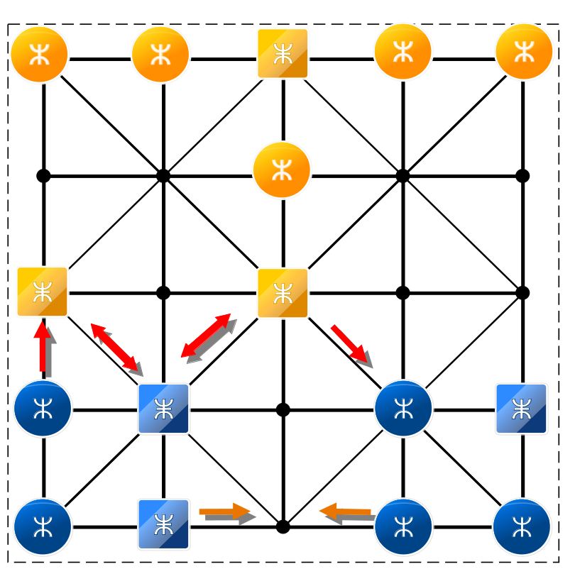 En la representación Pastores está mostrada como círculos y guerreros como cuadrados. Las piedras se mueven siempre siguiendo las líneas del tablero.* Los pastores pueden moverse (Y capturar) en cruz (↔️, ↕️) al próximo punto cercano.